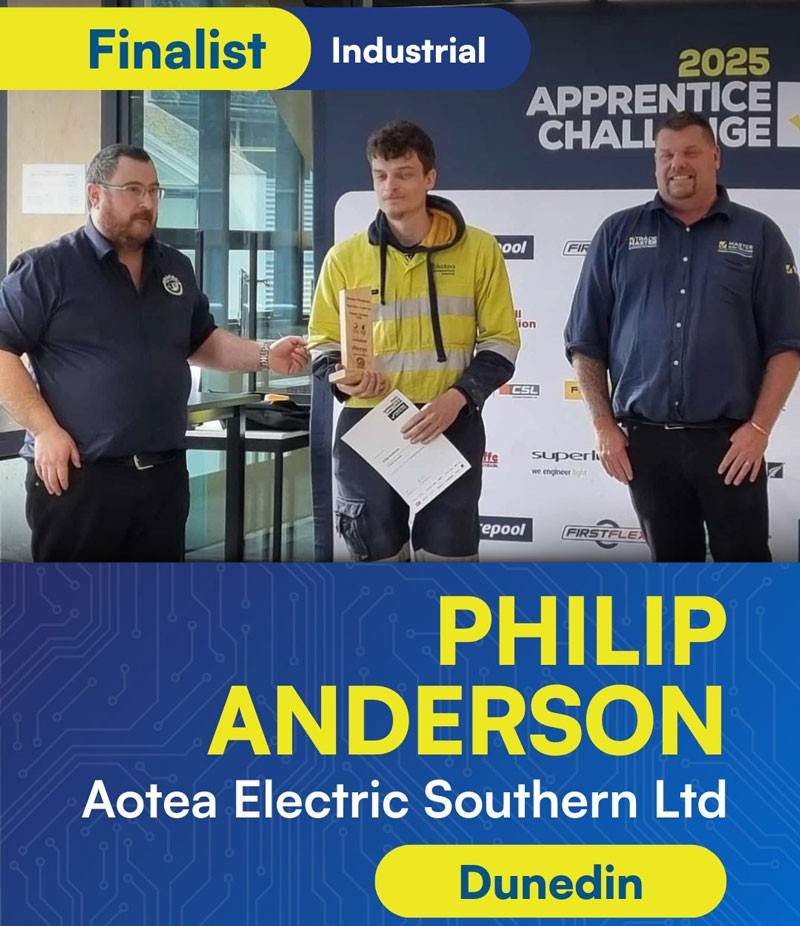 27 year old Philip is an electrical apprentice with Aotea Electric Southern in Dunedin, studying towards a New Zealand Certificate in Electrical Trade (Level 4) through Otago Polytechnic and EarnLearn.
