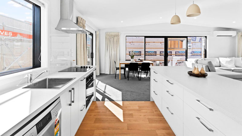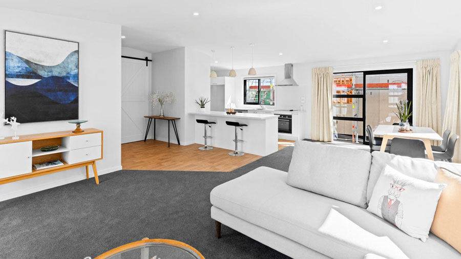 The modern three bedroom, two-bathroom, relocatable family home has been fully furnished thanks to partnerships with generous Dunedin businesses to supply interior materials including carpet, curtains, beds, linen, and kitchenware.