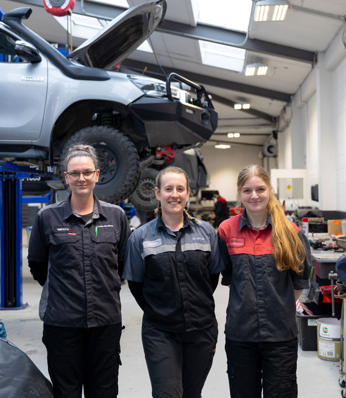 Automotive technicians Violet Farrell, Mikayla Denston, and Bobbie Glasier all began their studies with Otago Polytechnic's Automotive Engineering programmes, and are now thriving in the industry.