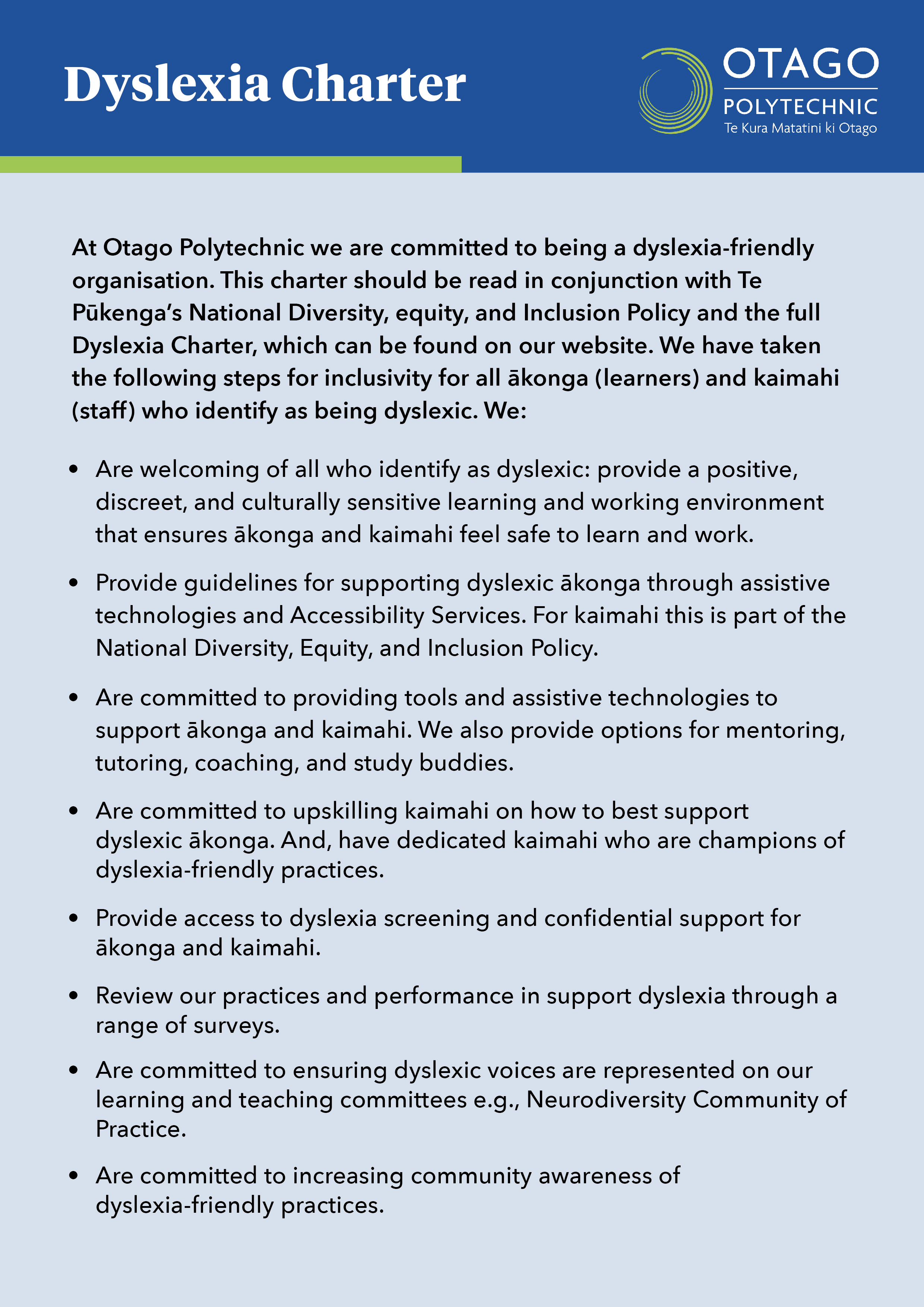 Below you can read the Otago Polytechnic Dyslexia-Friendly Charter, either summarised in one page or as a full-text document.